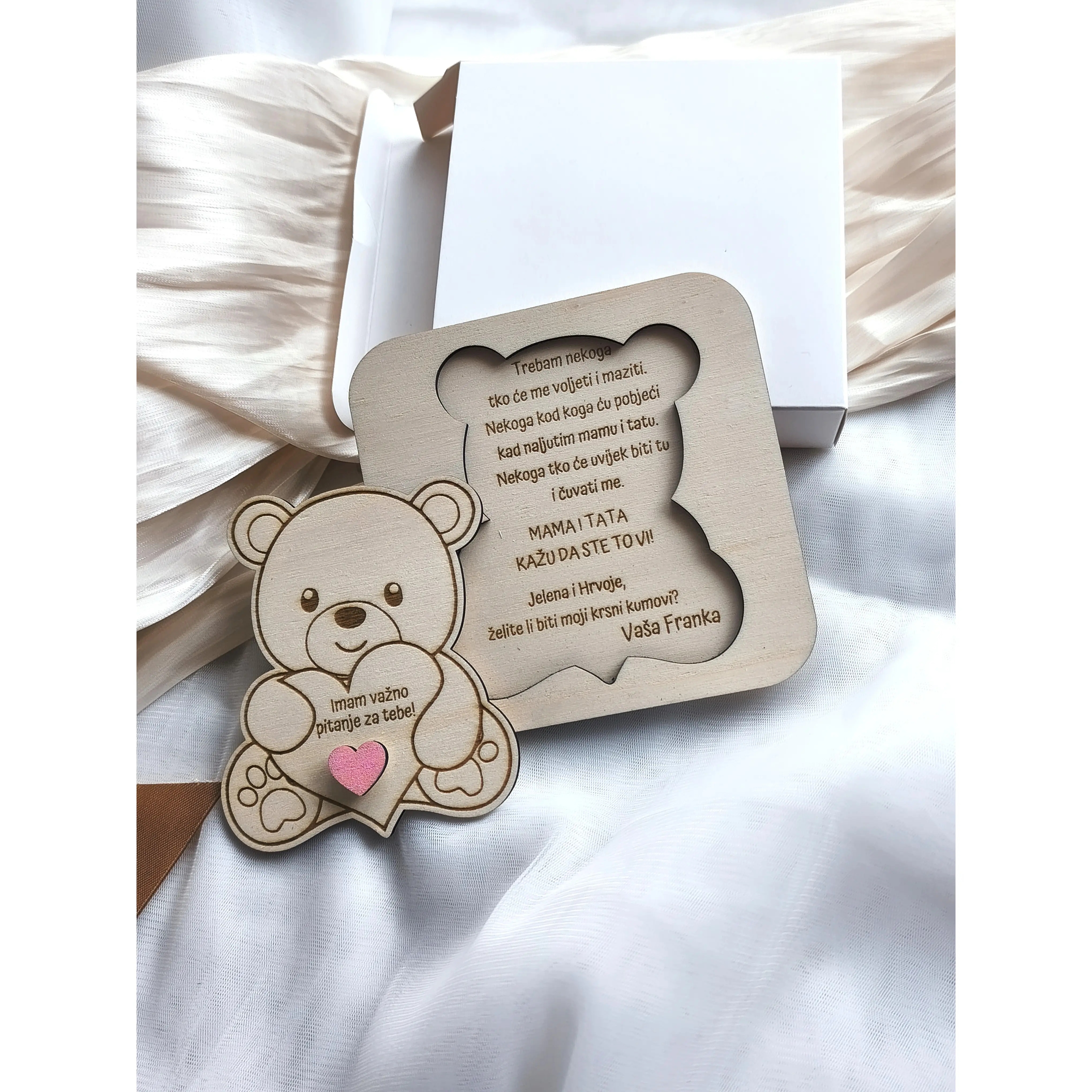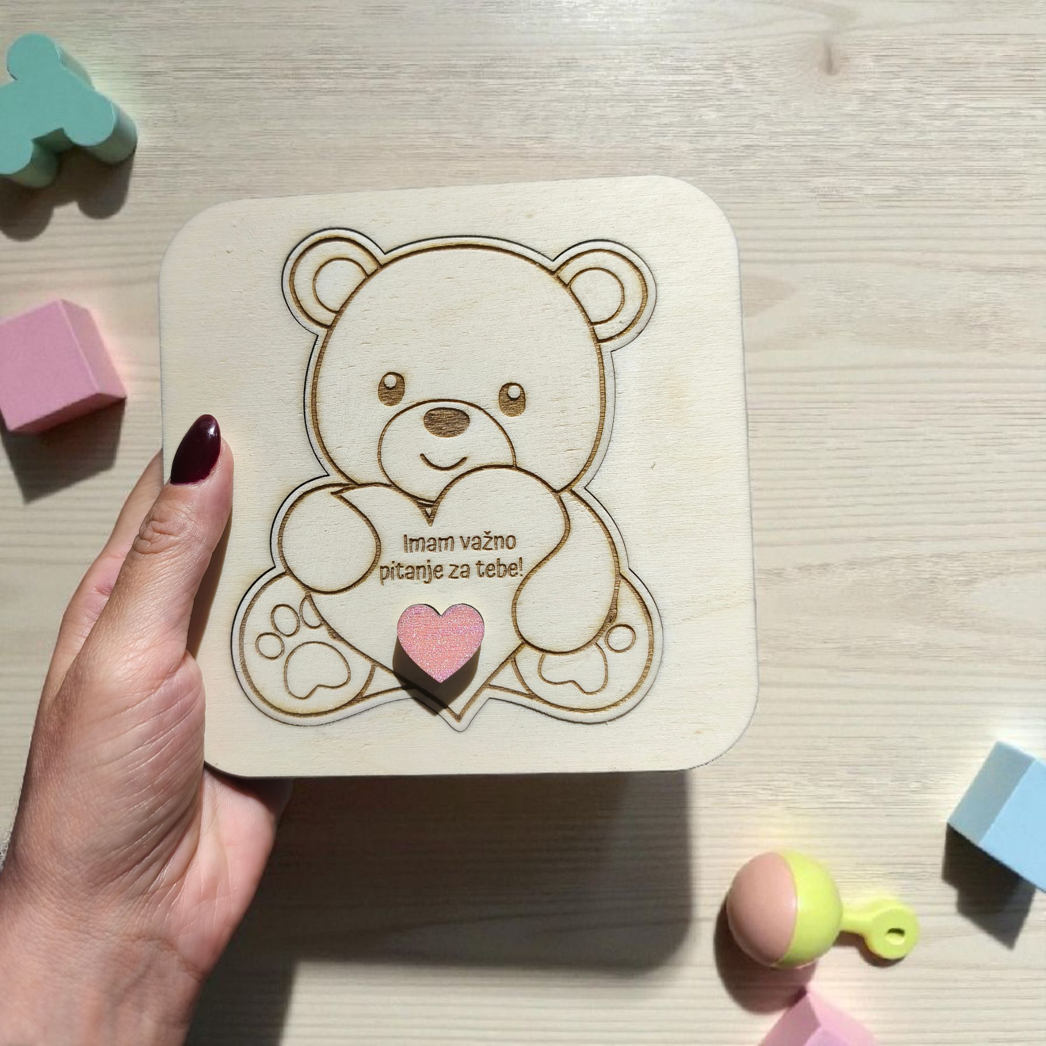 Pitalica je izrađena od kvalitetnog prirodnog drva, s preciznom laserskom gravurom koja osigurava dugotrajnost i postojanost. Topli tonovi drveta, simpatični motiv medvjedića i elegantan okvir čine ovaj proizvod predivnom uspomenom koja se čuva godinama.