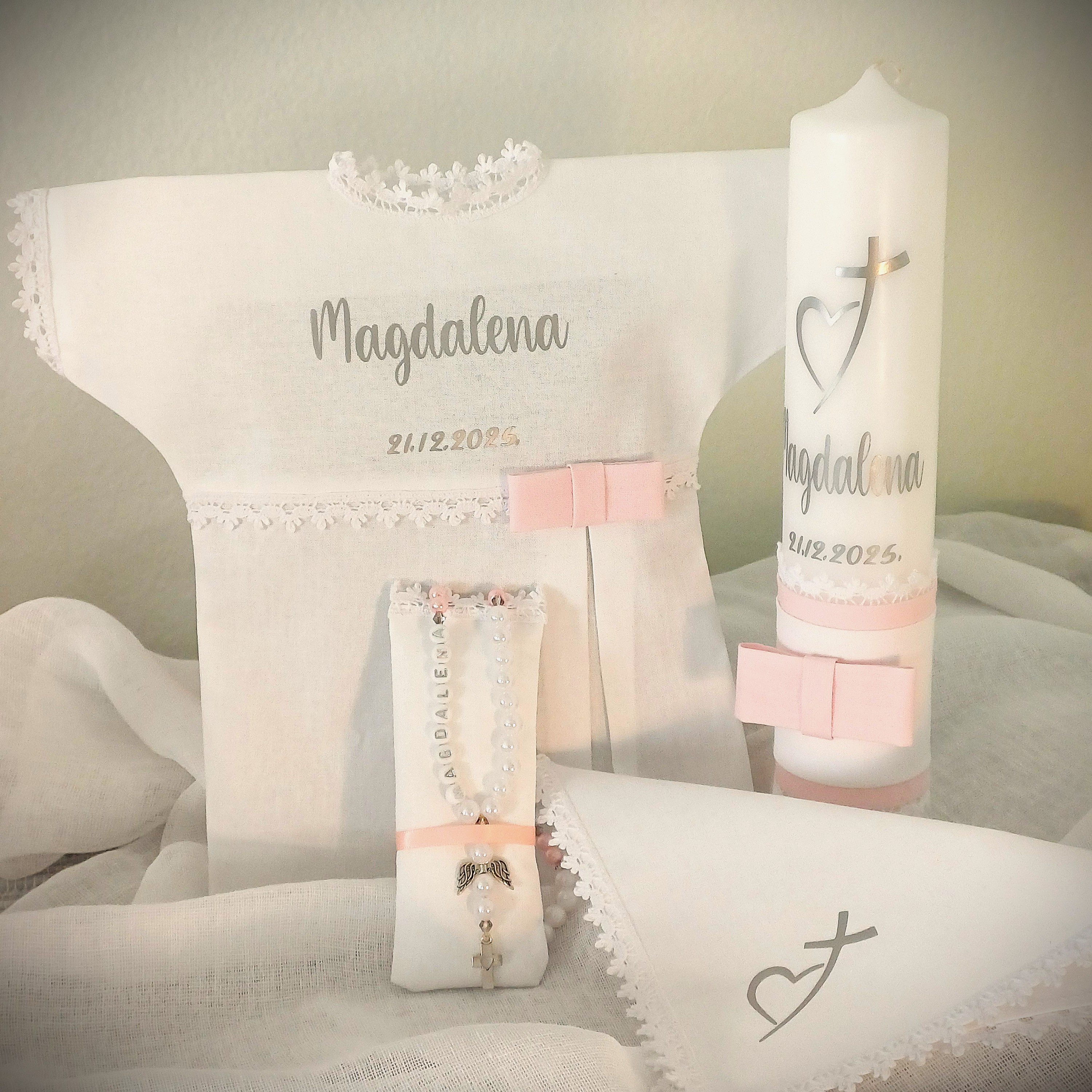 Krsni set za djevojčice "Magdalena" kombinacija je nježno roze i bijele boje sa diskretnom čipkom. Svaki dio seta je personaliziran a o načinu personalizacije dogovarat ćemo putem opcije "Pošalji poruku prodavaču"