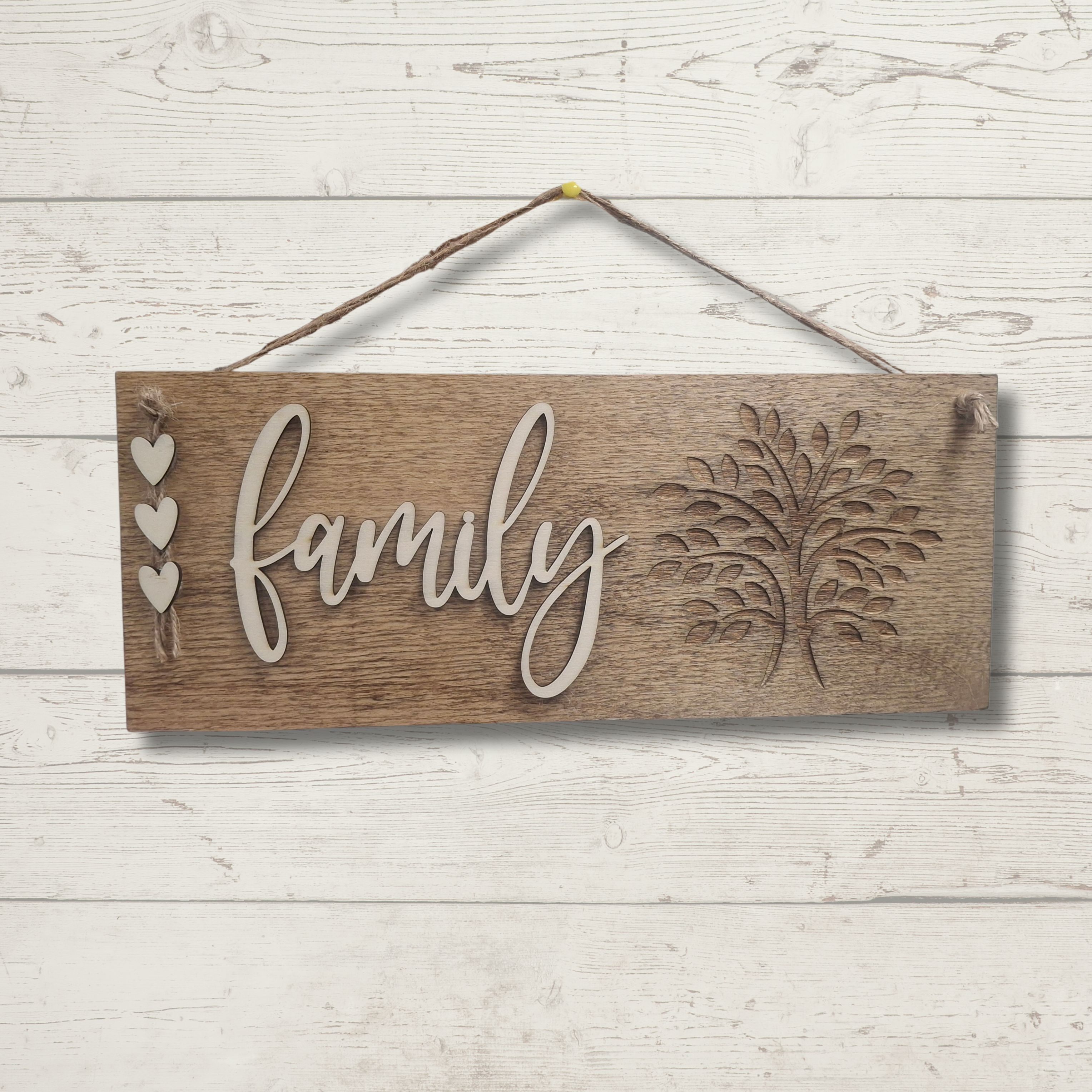 Dekorativna drvena viseća ploča izrađena s posebnom pažnjom na detalje. Prirodni izgled drveta u kombinaciji s nježnim natpisima i graviranim motivima čini ovu ploču toplim dodatkom svakom domu.