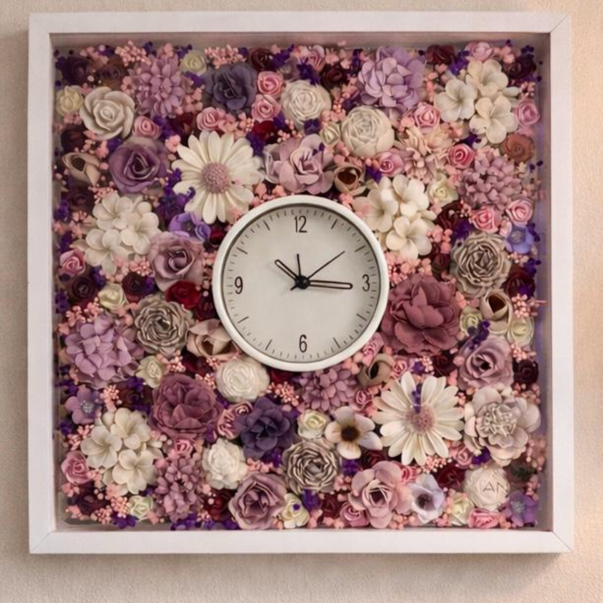 Unutar okvira nalazi se bogat 3D cvjetni aranžman koji stvara dubinu, teksturu i luksuzan vizualni efekt. Svaki detalj pažljivo je ručno složen, kombinirajući različite vrste cvijeća i nijansi kako bi se postigao skladan i elegantan izgled.