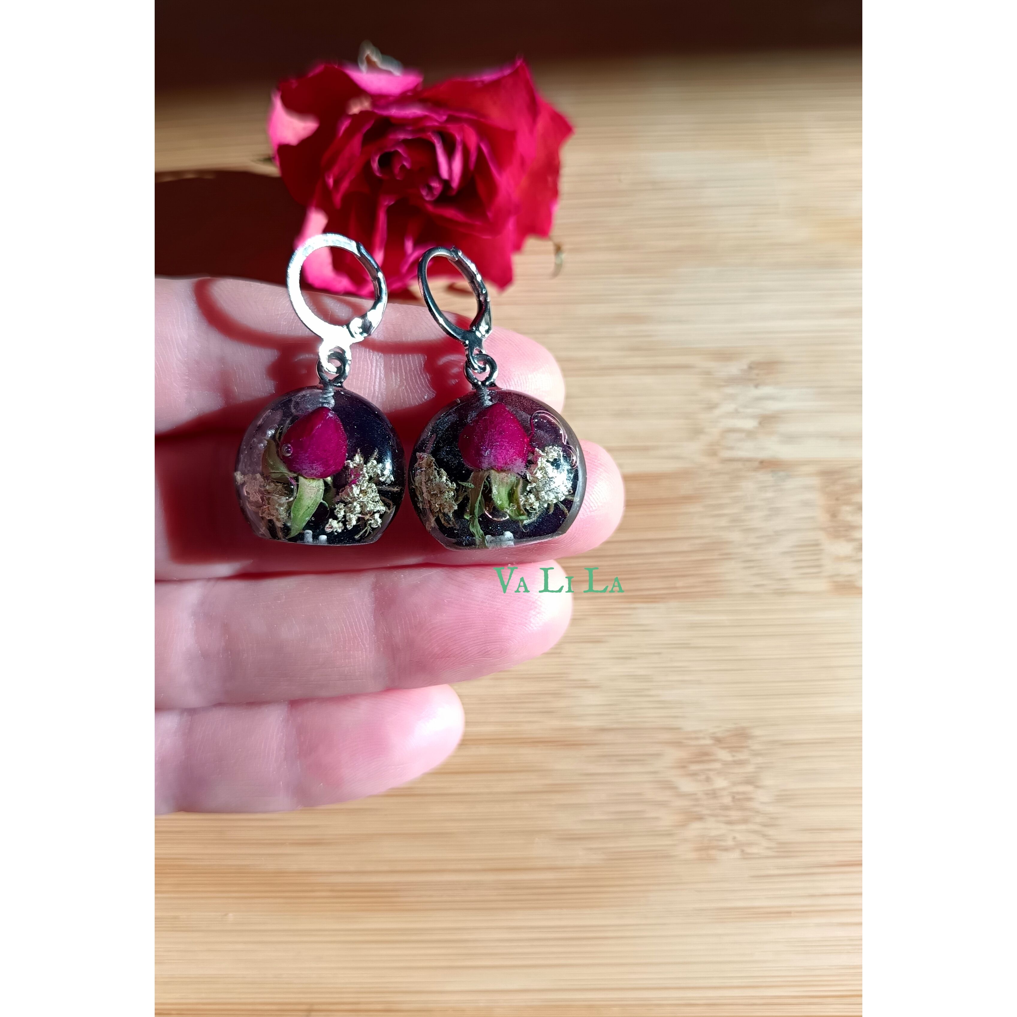 Naušnice rađene sa osušenim pupoljcima ružica i cvijetom divlje mrkve u epoxydnoj smoli.