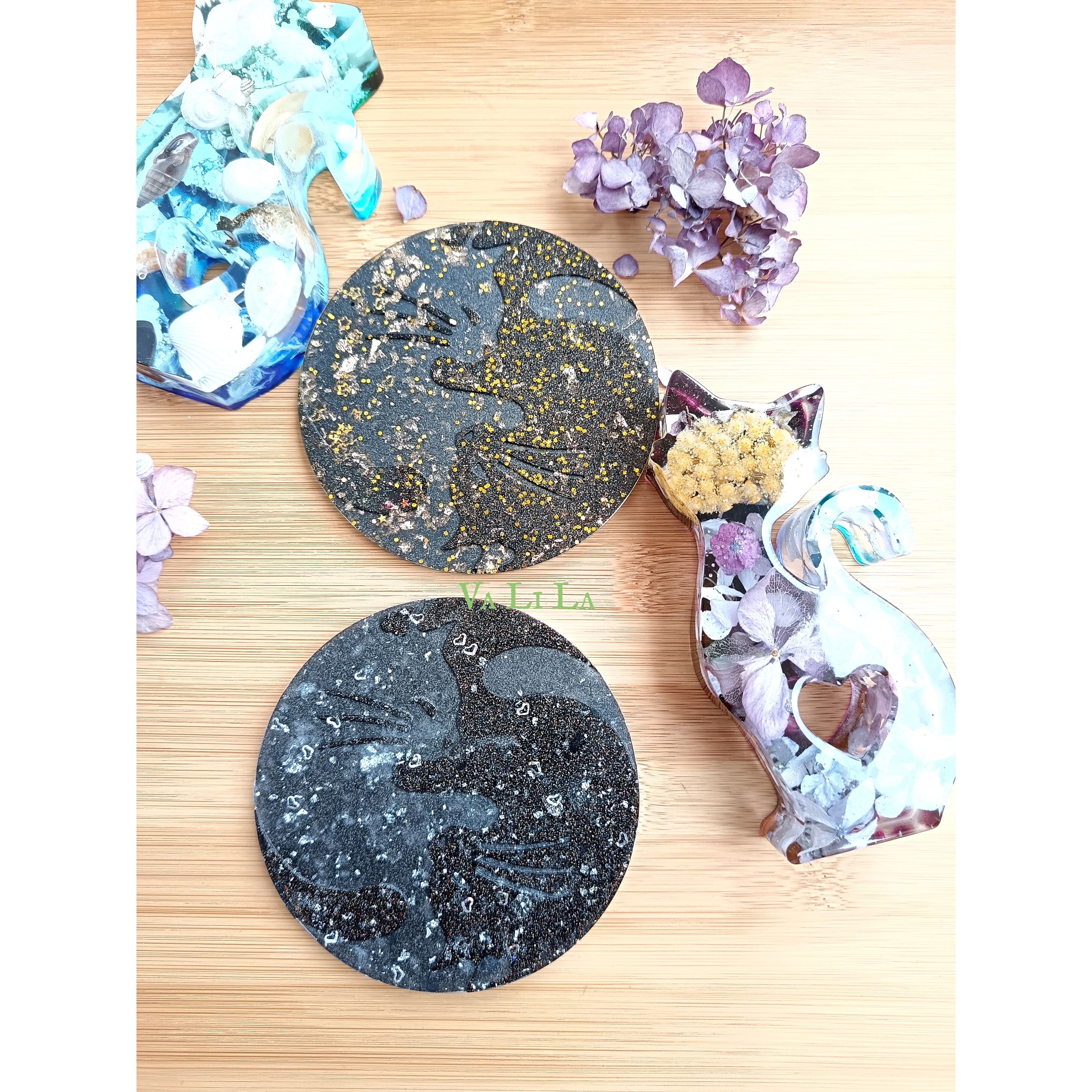 Radi se o yin yang mačaka, jedna je u srebrnoj a druga je u zlatnoj boji. Rađene su od epoxydne smole i pogodne su za hladne i tople predmeta, nikako ne vruće.