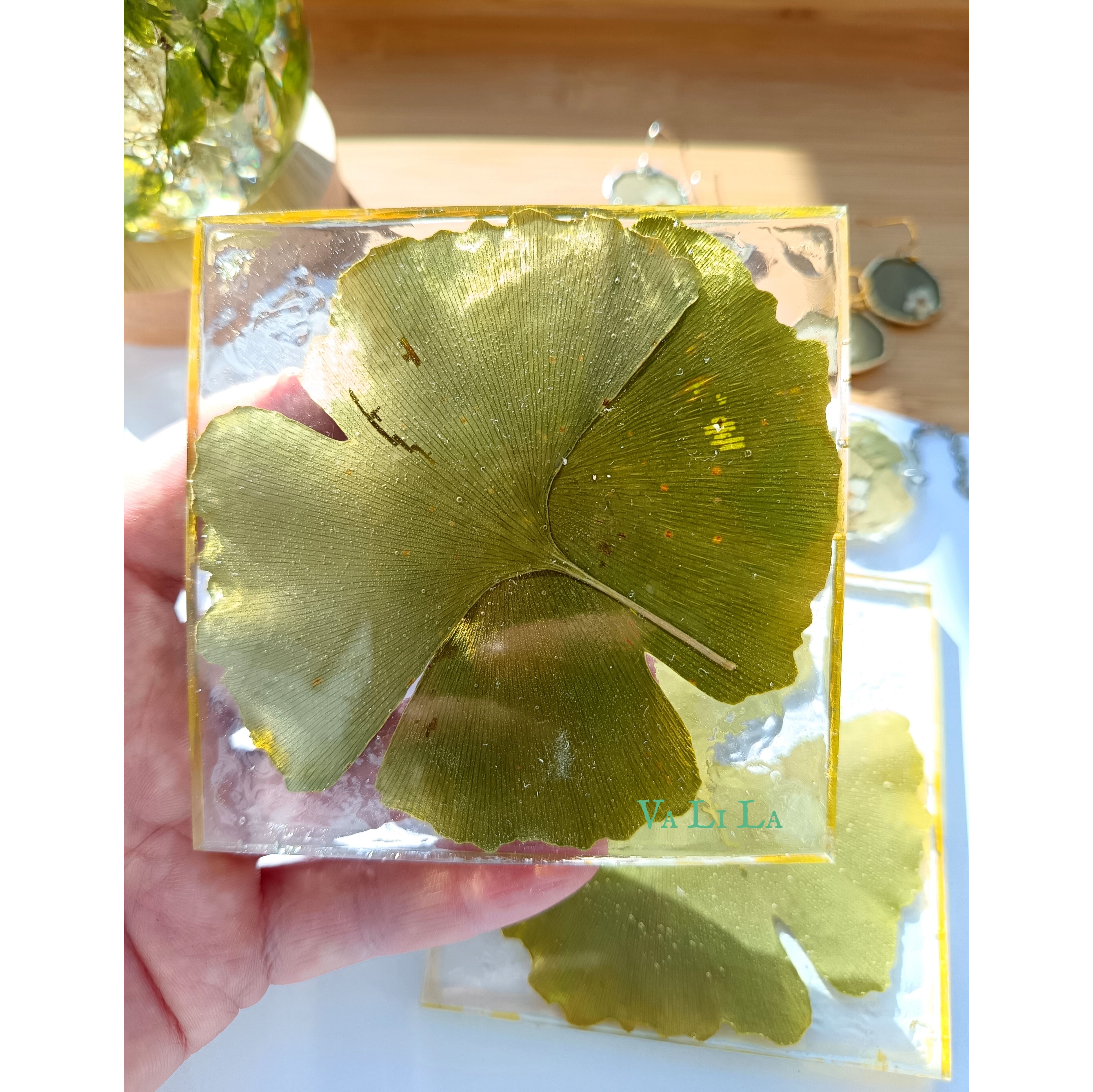 Ukrasni podmetači napravljeni su od osušenih listova ginka i epoxydne smole. Listovi su brani u parku Vruljica u sunčanom Zadru.