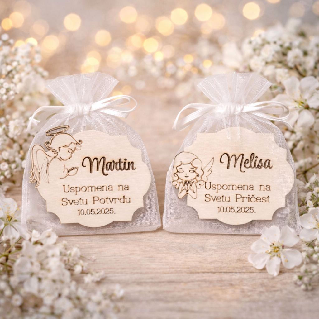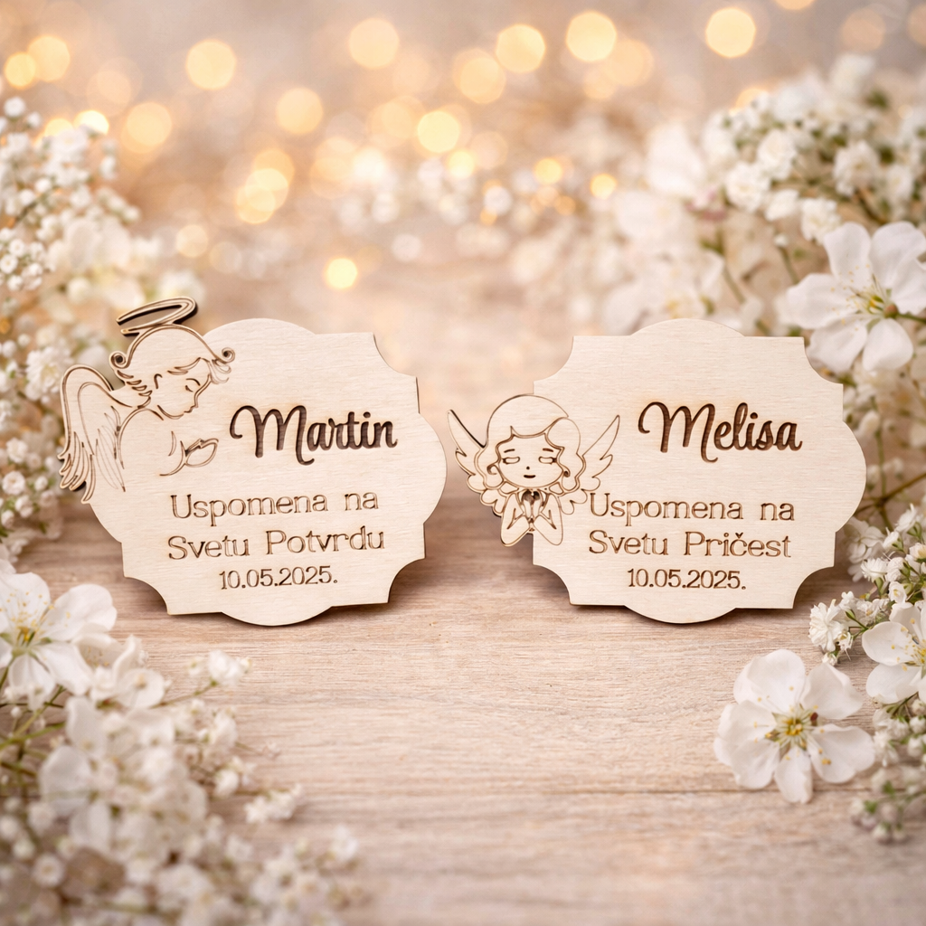 Izrađeni su od prirodnog drva s preciznom laserskom gravurom koja uključuje ime, naziv sakramenta i datum.