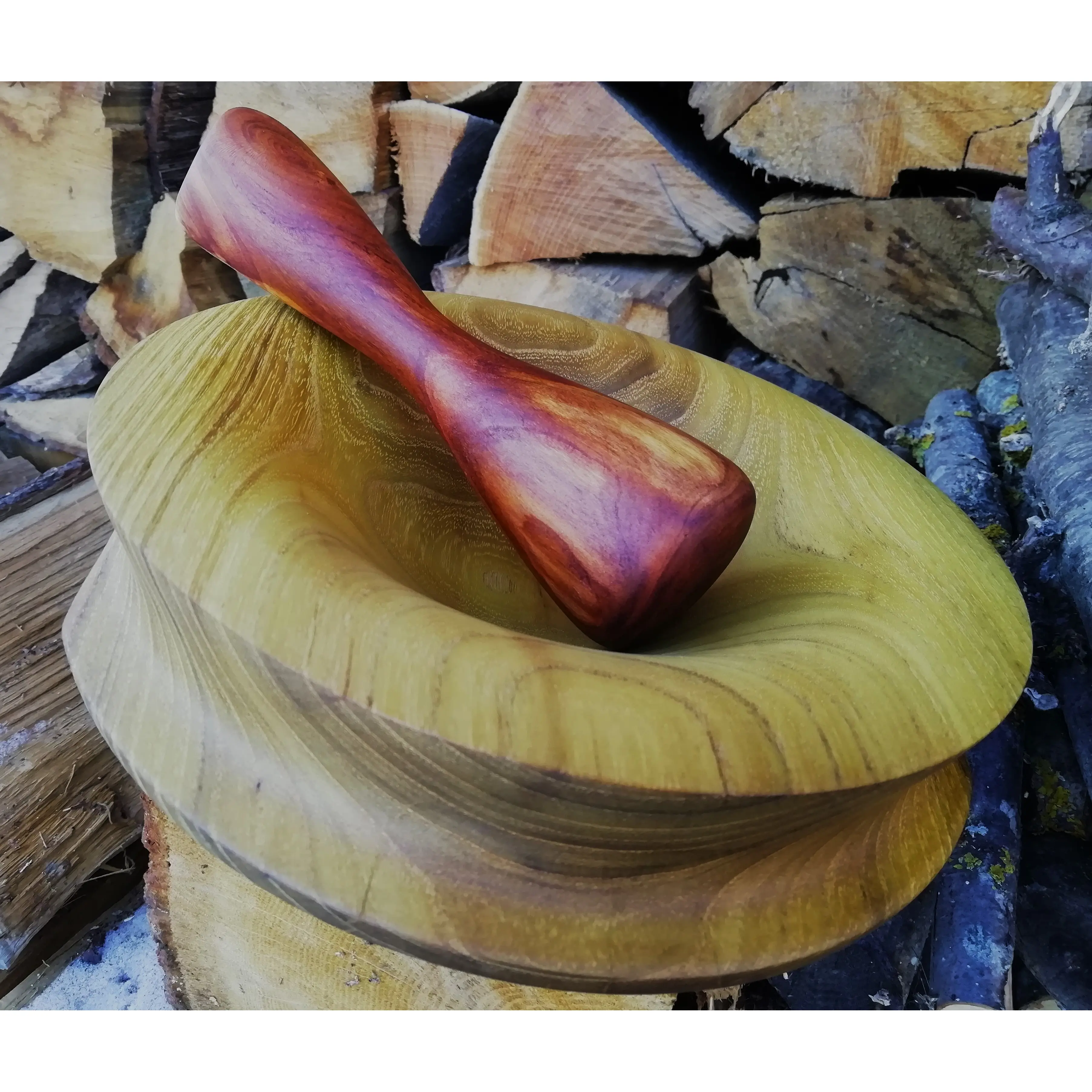 masivno izvedena posuda od bagrema i atraktivan tučak od šljive. bagrem 8 x 22 cm, šljiva 5 x 16,5 cm. privlačno, trajno, rukom rađeno i unikatno..